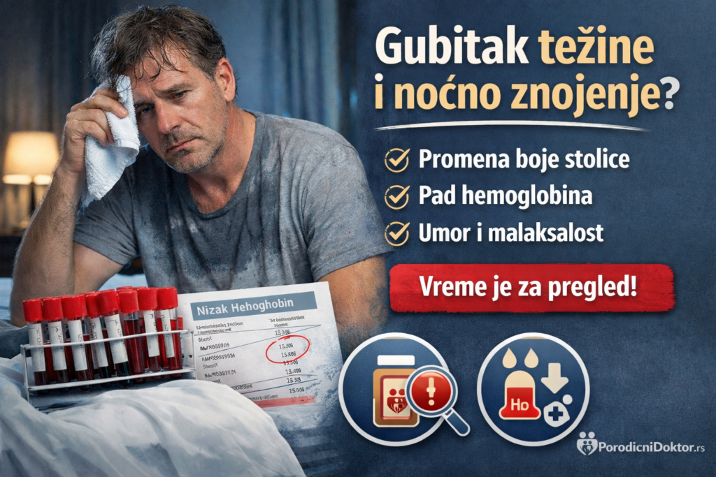 Gubitak težine i noćno znojenje nisu nešto što treba ignorisati, posebno ako traju i ponavljaju se. Ako uz to primećujete promene u stolici ili vam je na nalazima snižen hemoglobin, vreme je za pregled i jasne odgovore.